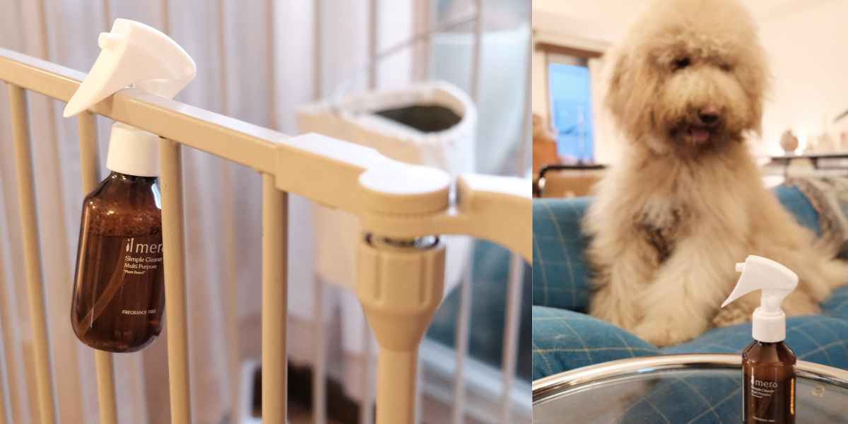 il meroのSimple Cleanerは、ヤシ、オーツ⻨、りんご、トウモロコシ、小⻨など100%植物由来の洗浄成分を使用しているので、ペット用品のお掃除はもちろん、シャンプーなど日々のケアにもお使い頂けます。